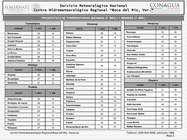 El viento dominará del Norte y Noreste con velocidades de 20 a 30 km/h, con rachas de 40 km/h. especialmente en la porción costera. Por su parte la temperatura diurna mantendrá ambiente cálido a caluroso en zonas de planicie y costa, mientras que en zonas montañosas será templado, persistiendo durante la noche y madrugada ambiente frío en zonas altas especialmente en los límites entre Veracruz y Puebla.