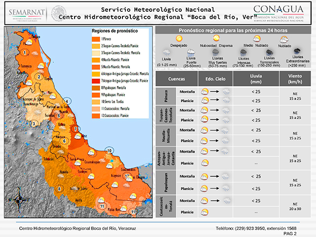 Los remanentes de la masa de aire frío que le dio impulso al frente frío y nubosidad propagada en niveles medios y altos por la corriente en chorro, así como un canal de baja presión localizado sobre el occidente del Golfo de México, mantendrán las condiciones de cielo medio nublado a nublado con presencia de nieblas, neblinas y lluvias dispersas con acumulados menores a 25 mm, principalmente sobre planicies, costa y regiones serranas de las cuencas de los ríos Pánuco, Tuxpan, Nautla y Misantla y sobre las zonas montañosas desde la cuenca del río Cazones hasta la cuenca del río Tonalá. El viento se mantendrá débil, variable durante la mañana, fijándose del Noreste durante la tarde con velocidades de 15 a 25 km/h. La temperatura mantendrá el ambiente frío a templado en regiones montañosas y templado a cálido en planicies y costa, previendo se registren temperaturas cercanas a 2° C durante la madrugada sobre la sierra norte de Puebla, Huayacocotla, inmediaciones del Cofre de Perote y Pico de Orizaba.