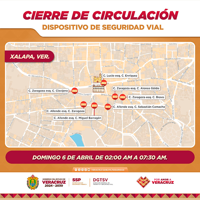 Calles que estarán cerradas el domingo 6 de abril de las 2:00 a las 7:30 horas, con motivo de un rodaje fílmico en Xalapa. Tome sus previsiones.
