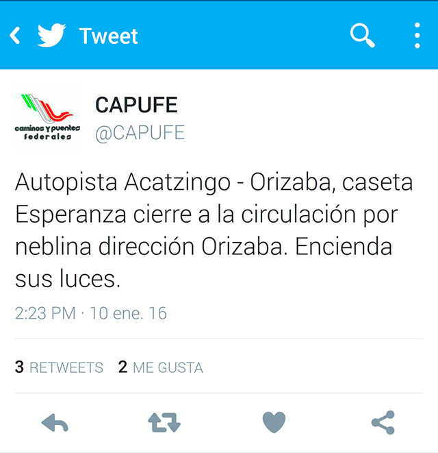 En su cuenta de twitter CAPUFE alerta a conductores