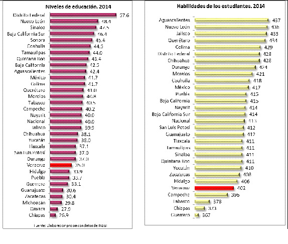 Así, a pesar de que en Veracruz hay 120,00 profesores y el gasto para el sostenimiento de esta plantilla es de 33,372 mdp el “nivel de educación” medido por el porcentaje de la PEA de 15 años y más que cuenta con al menos educación media superior es de 35%, un valor que ubica a Veracruz en el lugar 25º entre los estados de peor desempeño. De igual modo el “Índice de habilidades de los estudiantes” que es la medida en que los alumnos de 15 años cerca del final de la educación secundaria han adquirido los conocimientos necesarios en matemáticas, alcanza un valor de 402, lo que coloca al estado en el lugar 26º entre los de peor desempeño.
