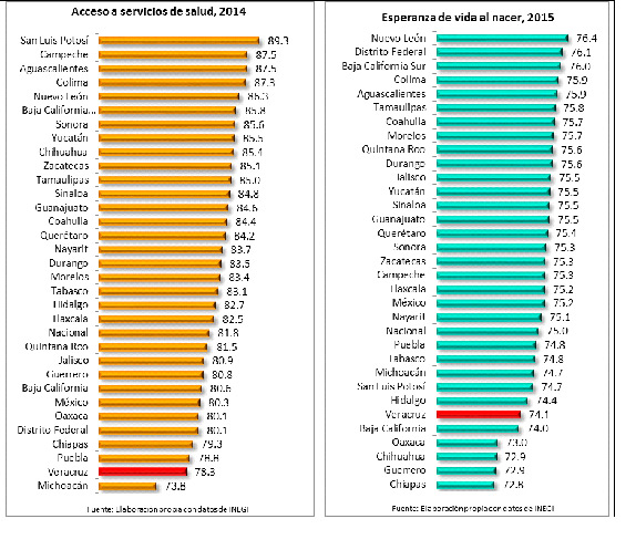 En materia de salud, el personal con que se cuenta es de 28,000 personas con un gasto para el pago de sus salarios superior a los 10,000 mdp, sin embargo, los resultados en salud pública en el estado son pésimos. Así, el porcentaje de la población que cuenta con acceso a servicios de salud pública es de 78.3% lo cual ubica al estado en el lugar 31º entre los estados con los más bajos valores en este rubro. De igual modo, la “esperanza de vida” de 74.1 años es una de las más bajas del país y coloca al estado en el lugar 28º entre los de peores resultados.