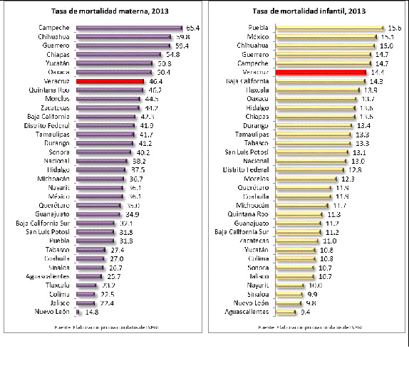Asimismo la “tasa de mortalidad materna” es de las más altas del país con un 46.4, por lo que ocupa el 7º lugar entre los estados en peor situación, y la “Tasa de mortalidad infantil” es de 14.4 también de las más altas del país, lo cual ubica a Veracruz en el 6º lugar entre los de peor resultado en materia de salud.