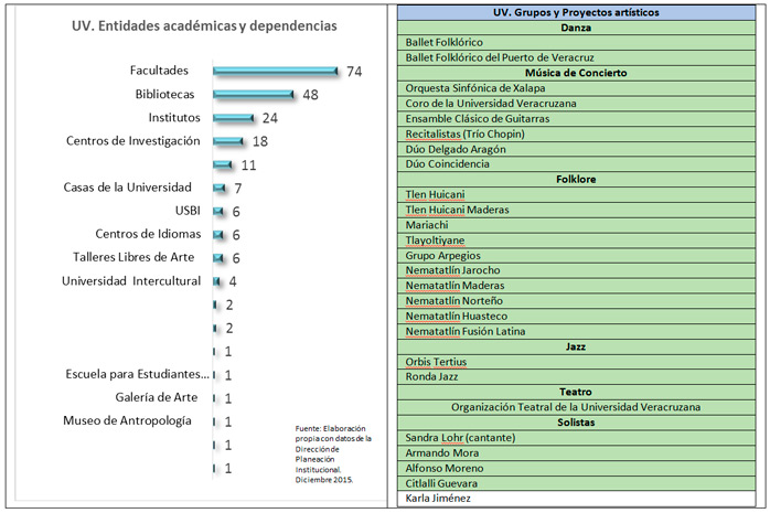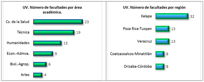 Y por supuesto la UV no sólo es docencia, junto con estas actividades realiza funciones de investigación, difusión de la cultura y extensión de los servicios universitarios. Para todo ello cuenta con 74 facultades que imparten 314 programas educativos: 174 licenciaturas, 132 posgrados y 8 carreras de técnico superior universitario, todo ello en 5 sedes: Xalapa donde se ubican 32 facultades, Veracruz con 13 facultades, Poza Rica-Tuxpan 13 facultades, Coatzacoalcos- Minatitlán 8 facultades y Córdoba-Orizaba 8 facultades. Por área académica la UV tiene 13 facultades en el área de Ciencias de la Salud, 19 en el área técnica, 13 en Humanidades, 9 en Económicas-administrativas, 6 en biológico-agropecuarias y 4 en artes.