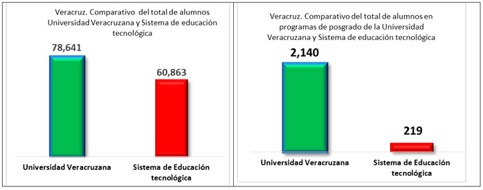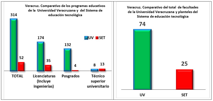 Comparativamente la UV atiende a un mayor número de alumnos en un mayor número de modalidades educativas y en un mucho mayor número de planteles. La matrícula de la UV es de 78,641 alumnos, es decir, 17,641 más que el SET.