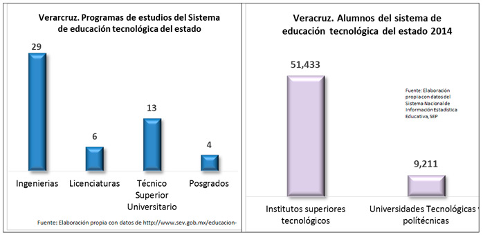 Por lo que hace a la oferta educativa hay que señalar que el Sistema de Educación tecnológica (SET) del estado está conformado por 21 institutos tecnológicos, 3 Universidades tecnológicas y una Universidad politécnica, que en conjunto ofrecen 29 ingenierías, 6 licenciaturas, 13 carreras cortas de técnico superior universitario y 4 posgrados. Tienen un total de 60,863 alumnos de los cuales 51,653 pertenecen a los Institutos tecnológicos (85%) y 9,211 (15%) a las universidades tecnológicas.