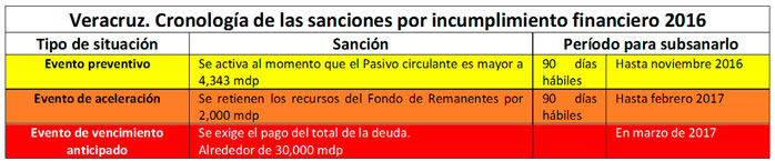 Este incumplimiento (producto del desorden financiero y la corrupción) ha activado un “Evento preventivo” emitido por los acreedores, que advierte que si en un plazo de 90 días hábiles no se subsana esa falta, se activará un “Evento de Aceleración” lo implica que en 2017 no le serían entregados 2,000 mdp del Fondo de Remanentes, monto que es equivalente al 7.7% de las participaciones federales. Es decir, una mayor limitación de sus ingresos públicos que pondría en serios problemas a la nueva administración.