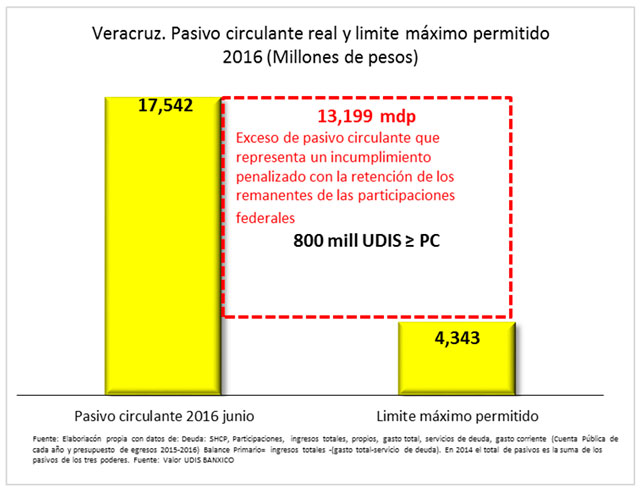 Con un pasivo circulante de esta magnitud el gobierno de Veracruz está incumpliendo abiertamente el compromiso financiero (estipulado en la mayoría de los créditos bancarios contratados y en las emisiones bursátiles) que lo obliga a mantener este rubro en una magnitud inferior o igual a 4,343 mdp (800 millones de UDIs), lo cual significa que se ha excedido en 13,1993 mdp.