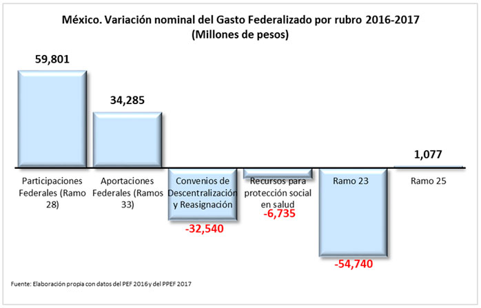 En menor medida, pero en una magnitud importante, disminuyen los recursos de los Convenios de Descentralización y Reasignación los cuales caen en 32,540 mdp. Se trata de son acuerdos que las dependencias del Gobierno Federal firman con las entidades federativas para transferir recursos presupuestales susceptibles de ser federalizados y otros con el propósito reasignar recursos para el cumplimiento de diversos objetivos de los programas federales.
