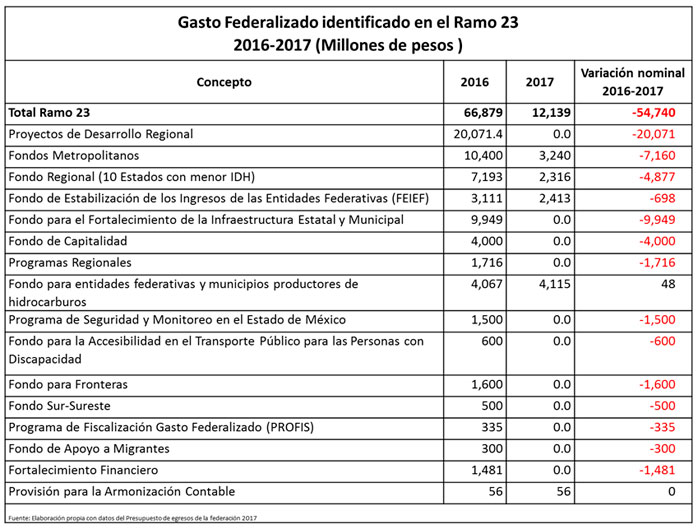 La reducción más amplia de este grupo de partidas presupuestales se observa en el Ramo 23 donde la disminución será de 54,740 mdp, lo cual representa una caída de 82% con respecto al año anterior. Este rubro está compuesto por fondos que la federación transfiere a Entidades Federativas y Municipios mediante la firma de un convenio y sirven básicamente para la realización de obras públicas.
