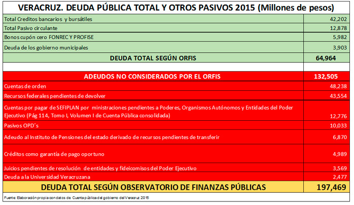 Miente el ORFIS acerca de la deuda pública de Veracruz en Cuenta Pública 2015 ya que no es de 64,586 millones de pesos (mdp) como afirma en su Informe del Resultado. Esto es sólo una parte porque, no se están incluyendo pasivos que constan en la propia Cuenta Pública sujeta a revisión.