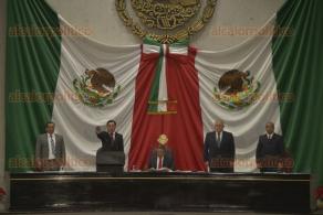 Ya en la tribuna de la Mesa Directiva, con el presidente José Manuel Pozos Castro, el vicepresidente Alexis Sánchez García y el secretario Jorge Moreno Salinas acompañándolo, según lo que marca el artículo 45 de la Constitución, con el brazo derecho levantado, Cuitláhuac dijo: