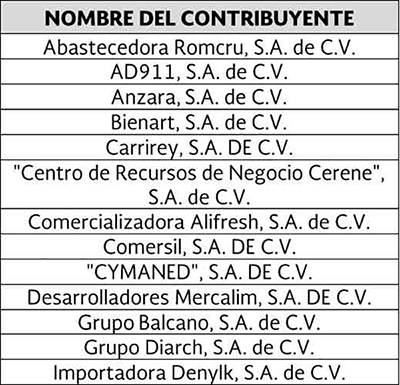 Del análisis realizado al interior del SAT, se conocieron los nombres de 34 contribuyentes, de los cuales 33 son personas morales, una persona física, además 26 directamente involucradas y ocho más asociadas.