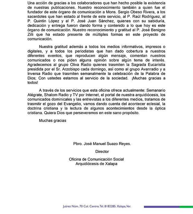 Agradece a lectores, medios informativos y a todos los periodistas que han dado cobertura a sus diferentes eventos
