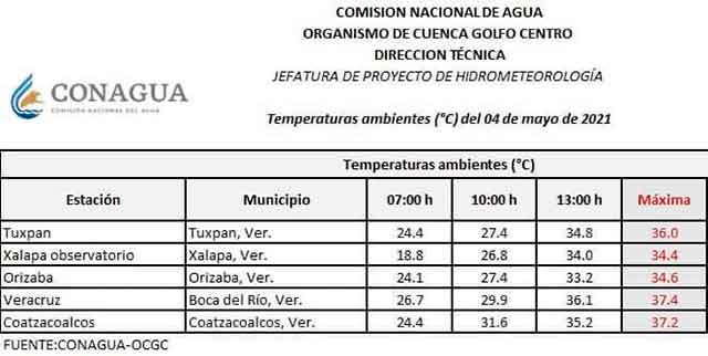 Orizaba reporta a la sombra 34.6 grados centígrados, y Poza Rica, 35 grados a la sombra y 25.2 grados Celsius en Perote.
