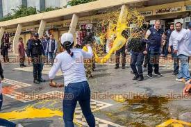 El enfrentamiento donde estaban unos 50 ambulantes con un centenar de municipales se tornó colorido y dulce ya que los inconformes lanzaron a los uniformados el jarabe con el que preparan sus bebidas refrescantes para su venta, con la intención de evitar se llevaran sus productos y equipo de trabajo.
