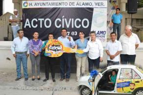 Cuando los honores a nuestros símbolos patrios terminaron en los bajos de palacio municipal, el Alcalde de Álamo entregó el coche último modelo a la Señora Lidia Azuara Herbert, ganadora del sorteo llevado a cabo por la administración para estimular el pago al impuesto predial y como premio a quienes contribuyen con este impuesto puntualmente.