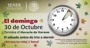 El domingo 30 de octubre concluye el Horario de Verano en la República Mexicana, por ello se recomienda a las personas quela noche de estesábado, antes de irse a dormir, atrasen una hora sus relojes, de modo que al día siguiente reanuden sus actividades con el horario de invierno.