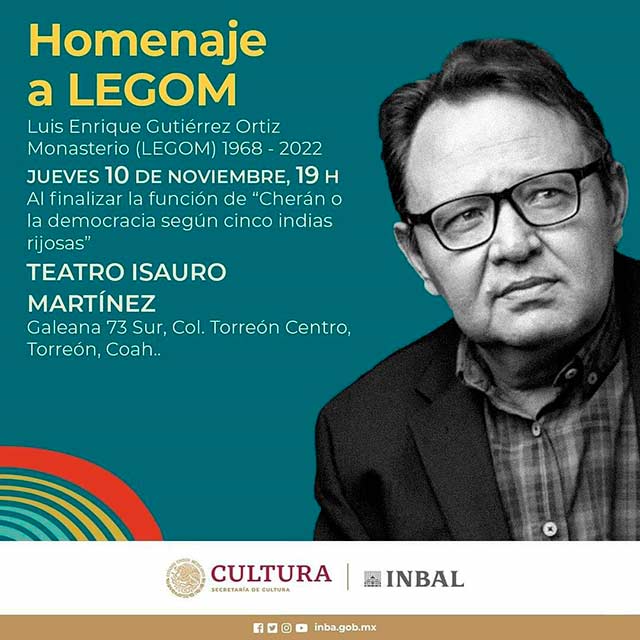 En el marco de la inauguración de la 42 Muestra Nacional de Teatro, será el homenaje para el dramaturgo Luis Enrique Ortiz Monasterio, mejor conocido como LEGOM, al final de la presentación de la puesta en escena de “Cherán o la democracia según 5 indias rijosas”, será el homenaje a este dramaturgo, ganador del premio Nacional de Dramaturgia Manuel Herrera” de Querétaro, en tres ocasiones.