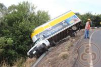 Debido al exceso de velocidad en que se desplazaba el conductor de una camioneta de la empresa Coppel, sobre la curva ubicada por la comunidad de Puerta Nueva perteneciente a San Andrés Tuxtla, ésta terminó prácticamente volcada al salirse de la cinta asfáltica.