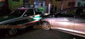 En los primeros minutos de este martes, un aparatoso choque se registró en la avenida Miguel Alemán, a la altura de la colonia Laredas de Macuiltépetl, cuando la conductora de un vehículo Honda City perdió el control de la unidad e impactó al taxi número XL-2012, el cual a su vez terminó colisionando contra un automóvil particular que se encontraba estacionado.