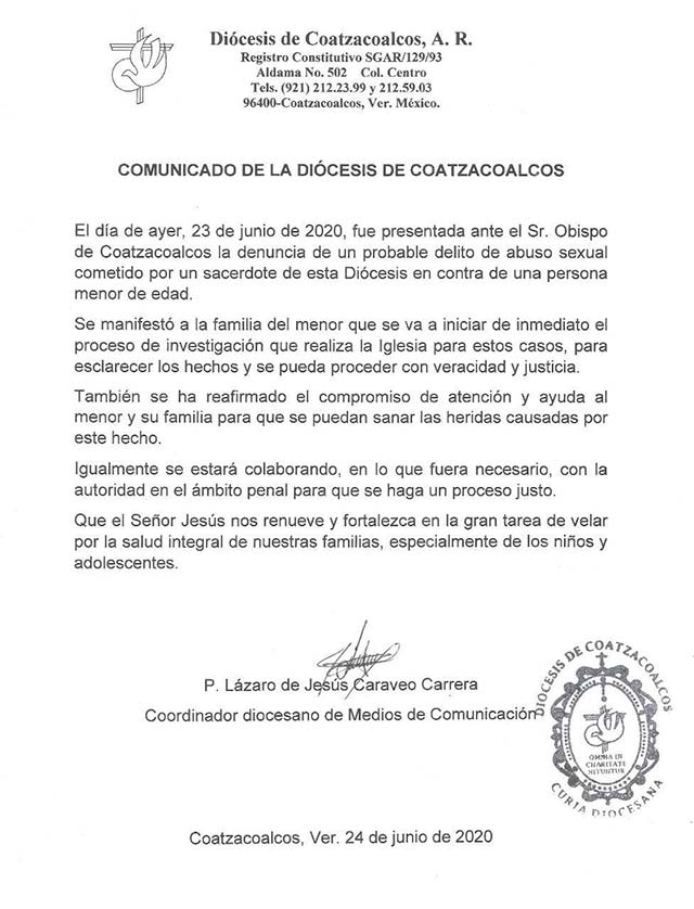 A través de comunicado, el Vocero de la Diócesis de Coatzacoalcos, Lázaro Caraveo Carrera, anunció que iniciará la investigación sobre el probable delito de abuso sexual a menor de edad por parte de sacerdote, denuncia presentada este 23 de junio. Expone que de ser necesario, colaborará con la autoridad penal.