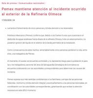 La empresa explicó que las fuertes lluvias provocaron el desborde de aguas aceitosas hacia afuera de la refinería “Olmeca”, donde se registró un estancamiento y la posterior ignición del líquido en el exterior de la barda perimetral de la instalación. Como consecuencia de estos hechos, lamentablemente 5 personas perdieron la vida, entre ellos, una trabajadora de PEMEX.