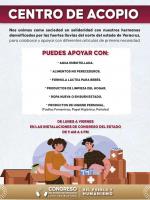 El Congreso del Estado de Veracruz, con el liderazgo del presidente de la Junta de Coordinación Política (Jucopo), diputado Esteban Bautista Hernández, y de la presidenta de la Mesa Directiva, diputada Naomi Edith Gómez Santos, abrió un Centro de Apoyo para el acopio de víveres y productos no perecederos que serán enviados a las familias damnificadas en la región norte de la entidad, por la reciente contingencia climatológica.