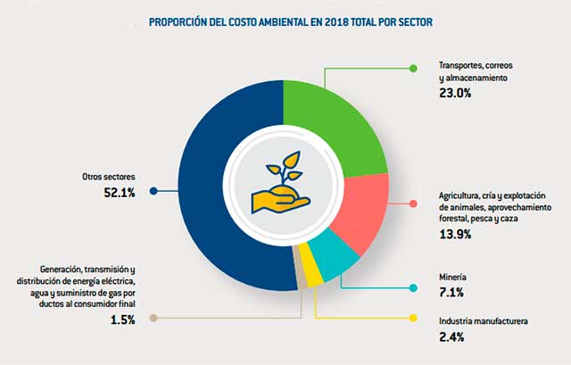 Cabe mencionar que la contaminación atmosférica representó el mayor costo ambiental en 2018, con un monto de 656,779 millones de pesos. Le siguen los gastos por la degradación del suelo, equivalentes a 119,734 millones de pesos;los asociados a los residuos sólidos, 75,821 millones de pesos; por el agotamiento de hidrocarburos, 71,937 millones de pesos; los relacionados con la contaminación del agua, 42,750 millones de pesos; los del agotamiento del agua subterránea, 41,050 millones de pesos, y los del agotamiento de recursos forestales, 11,680 millones de pesos.