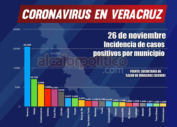 El municipio de Veracruz acumula 23,308 enfermos; le sigue el de Xalapa con 10,722; Córdoba 7,008; Orizaba 5,816; Boca del Río 2,623; Fortín 2,196; Ixtaczoquitlán 1,798; Río Blanco 1,540; Coatepec 1,529; Medellín de Bravo 1,448; Nogales 1,211; La Antigua 1,203; Camerino Z. Mendoza 868; Alvarado 730; Mariano Escobedo 718; Emiliano Zapata 684; Amatlán de los Reyes 580; Úrsulo Galván 576; Perote 567; Ixhuatlancillo 481; Paso de Ovejas 471; Rafael Delgado 449; Misantla 429; Tlapacoyan 405; Zongolica 379; Puente Nacional 359; Huatusco 342; Atzacan 303; Banderilla 280; Soledad de Doblado 243; Yanga 242; Manlio Fabio Altamirano 235; Altotonga 230; Actopan 225; Coscomatepec 217; Xico 213; Tlalixcoyan 211; Chocamán 201; Atoyac 186; Cuitláhuac 186; Paso del Macho 181; Atzalan 174; Huiloapan 173; Maltrata 143; Tlacotalpan 136; Jilotepec 129; Omealca 125; Jamapa 122; Acultzingo 121; Tezonapa 113; Alto Lucero 111; Teocelo 108; Cotaxtla 106; Tlalnelhuayocan 100.