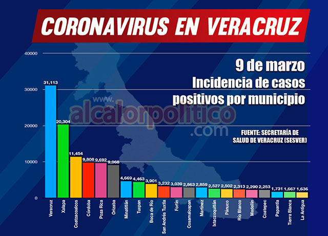 El municipio de Coatzacoalcos suma 11,454 casos; Minatitlán 4,669; San Andrés Tuxtla 3,232; Cosamaloapan 2,863; Tierra Blanca 1,667; Cosoleacaque 1,605; Tres Valles 877; Lerdo de Tejada 798; Jáltipan 680; Acayucan 652; Las Choapas 595; Agua Dulce 594; Catemaco 549; Nanchital 517; Santiago Tuxtla 441; Ángel R. Cabada 436; Isla 363; Hueyapan de Ocampo 363; José Azueta 312; Playa Vicente 138; Ixhuatlán del Sureste 122; Chacaltianguis 113; Oluta 103.