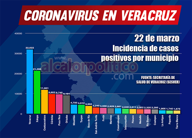 El municipio de Coatzacoalcos suma 11,951 casos; Minatitlán 4,700; San Andrés Tuxtla 3,240; Cosamaloapan 2,881; Tierra Blanca 1,675; Cosoleacaque 1,653; Tres Valles 887; Lerdo de Tejada 807; Jáltipan 682; Acayucan 679; Agua Dulce 600; Las Choapas 599; Catemaco 549; Nanchital 518; Ángel R. Cabada 443; Santiago Tuxtla 441; Hueyapan de Ocampo 366; Isla 363; José Azueta 312; Playa Vicente 138; Ixhuatlán del Sureste 124; Chacaltianguis 113; Oluta 103.
