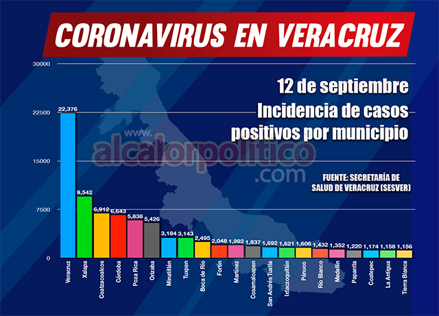 El municipio de Coatzacoalcos suma 6,912 casos; Minatitlán 3,184; Cosamaloapan 1,837; San Andrés Tuxtla 1,692; Tierra Blanca 1,156; Cosoleacaque 1,098; Tres Valles 674; Jáltipan 492; Lerdo de Tejada 475; Las Choapas 463; Nanchital 405; Acayucan 397; Agua Dulce 370; Carlos A. Carrillo 349; Catemaco 345; Ángel R. Cabada 326; Isla 299; Santiago Tuxtla 286; José Azueta 274; Hueyapan de Ocampo 193; Ixhuatlán del Sureste y Playa Vicente 110.