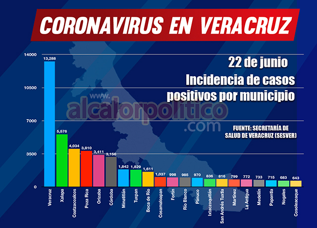 El municipio de Veracruz acumula 13,288 enfermos; le sigue el de Xalapa con 5,576; Orizaba 3,411; Córdoba 3,156; Boca del Río 1,611; Fortín 998; Río Blanco 985; Ixtaczoquitlán 836; La Antigua 772; Medellín 733; Nogales 683; Coatepec 555; Camerino Z. Mendoza 504; Alvarado 448; Mariano Escobedo 408; Perote 385; Emiliano Zapata 383; Úrsulo Galván 361; Ixhuatlancillo 262; Puente Nacional 225; Amatlán de los Reyes 223; Zongolica 211; Paso de Ovejas 210; Banderilla y Rafael Delgado, 182; Misantla 181; Actopan 152; Tlapacoyan 140; Atzacan 129; Huatusco 125; Coscomatepec 122; Manlio Fabio Altamirano 120; Altotonga 114; Soledad de Doblado 111; Tlalixcoyan 108; Xico 107; Huiloapan 106.