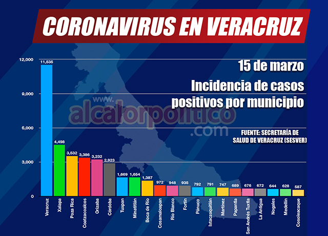 Coatzacoalcos registra 3,386 casos; Minatitlán 1,654; Cosamaloapan 972; San Andrés Tuxtla 676; Cosoleacaque 587; Tierra Blanca Con 398; Tres Valles 278; Lerdo de Tejada 204; Jáltipan 192; Carlos A. Carrillo 187; Isla 126 y Catemaco con 104.
