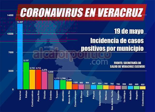 El municipio de Veracruz es el que ha registrado mayor actividad y sobresale con 12,387 casos acumulados; le sigue Xalapa con 5,137; Orizaba 3,379; Córdoba 3,030; Boca del Río 1,499; Fortín 964; Ixtaczoquitlán 824; La Antigua 698; Medellín 685; Nogales 680; Coatepec 505; Camerino Z. Mendoza 500; Emiliano Zapata 343; Úrsulo Galván 331; Ixhuatlancillo 262; Puente Nacional 203; Actopan 149; Atzacan 127; Coscomatepec 120; Soledad De Doblado 110; Huiloapan 105 y Altotonga 104; Xico, 100.