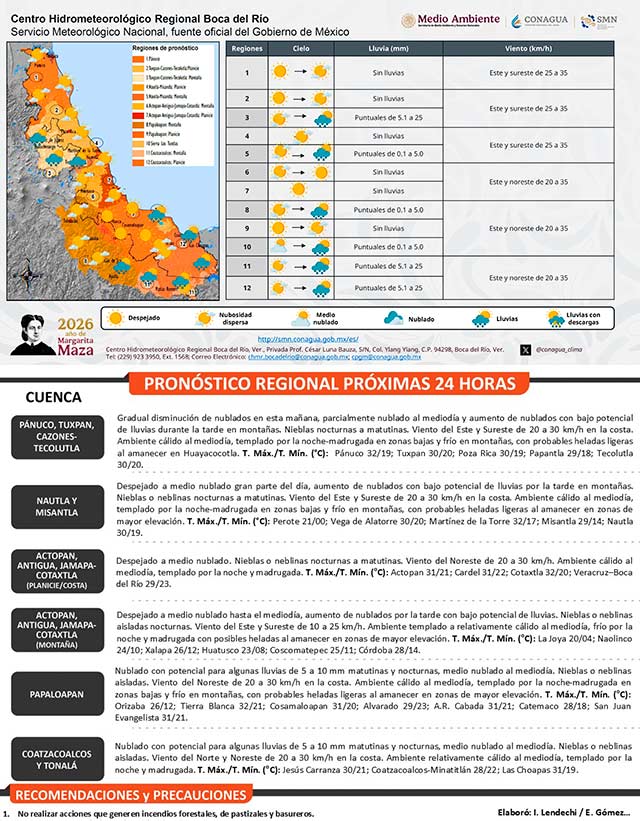 El análisis meteorológico es persistente en indicar que durante esta jornada continuará con poco cambio en la dinámica atmosférica en comparación con días anteriores, por lo tanto se prevén las siguientes condiciones del tiempo en el estado de Veracruz.