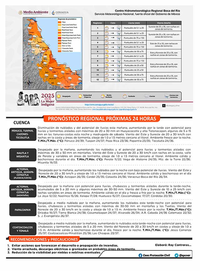 la presencia de un frente estacionario sobre el norte de México y una vaguada en el suroeste del Golfo de México y otra en el altiplano mexicano, mantendrán la entrada de aire marítimo tropical hacia el interior del estado de Veracruz que en combinación con el máximo calentamiento diurno y los efectos orográficos favorecerán esta tarde las condiciones para lluvias, chubascos o tormentas aisladas con máximos de 30 a 50 milímetros sobre regiones de montaña y Los Tuxtlas, siendo de menor importancia en el resto de la entidad.