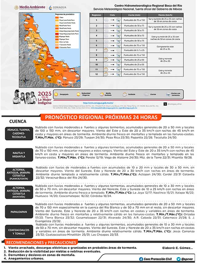Diversos modelos de pronóstico muestras que el temporal lluvioso continuará dominando en territorio veracruzano durante este fin de semana, con los acumulados más importantes de 70 a 150 milímetros en cuencas del norte, regiones montañosas y Río Blanco. Viento del sureste, este y noreste de 20 a 35 kilómetros por hora con rachas en costas y variables en áreas de tormenta. El ambiente diurno continuará fresco a templado en montañas y relativamente cálido en las llanuras-costas.