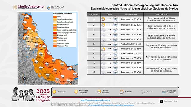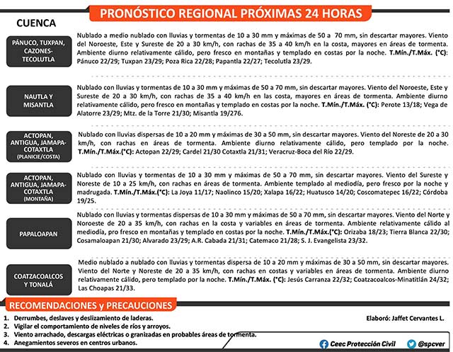 Se localiza una vaguada en el suroeste del Golfo de México y otra en el centro del País, mientras, 2 ondas tropicales se mueven al oeste en el centro y oriente de Mar Caribe. Además, en el Pacifico, un disturbio tropical al sur de las costas de Centroamérica, presenta alta probabilidad del 70 por ciento para desarrollarse en depresión tropical en 7 días, mientras se mueve al oeste y noroeste frente a costas del sur de México. Por lo anterior, en Veracruz persiste el temporal lluvioso, con eventos dispersos que podrían ser moderados a fuertes, con acumulados de 10 a 30 milímetros y máximos de 50 a 70 milímetros, sin descartar mayores. El viento del noroeste, noreste y sureste, con rachas en costas y variables en áreas de tormenta. El ambiente diurno continuará fresco a templado en montañas y relativamente cálido en las llanuras-costas.