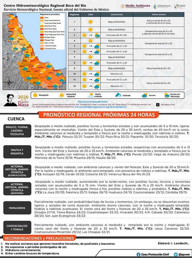 Se mantiene ambiente diurno caluroso en gran parte del estado de Veracruz. Viento dominante del sureste, este y noreste de 20 a 35 kilómetros por hora, con rachas de hasta 45 kilómetros por hora en la costa norte. La probabilidad de lluvias y tormentas es baja; sin embargo, no se descartan eventos ligeros y aislados, especialmente en zonas altas.