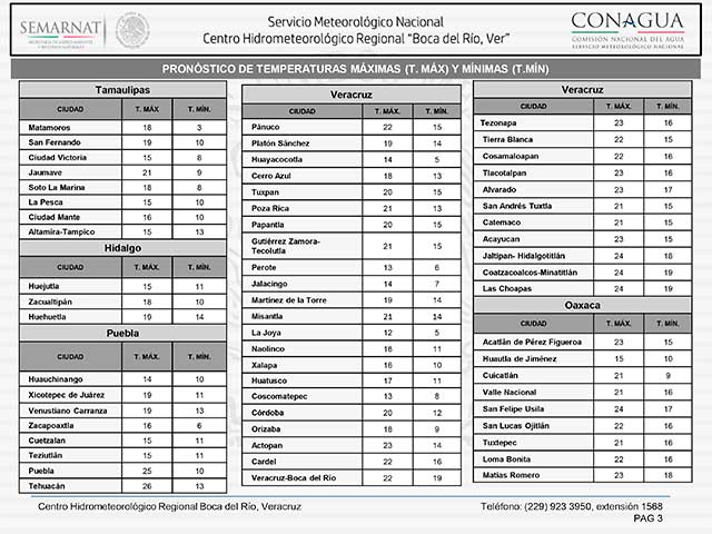 El sistema frontal No.24 continuará su desplazamiento hacia la Península de Yucatán y Mar Caribe, la masa de aire frío que lo impulsó seguirá afectando a la vertiente oriental del país. En el estado de Veracruz así como en regiones montañosas colindantes con Puebla y norte de Oaxaca se espera cielo medio nublado a nublado con lluvias menores a 25 mm desde las cuencas de los ríos Pánuco, Tuxpan y Cazones hasta la región montañosa central, para las cuencas de los ríos Papaloapan, Coatzacoalcos y Tonalá incluyendo la región de Los Tuxtlas se esperan lluvias locales fuertes (25 a 50 mm). El viento Norte de 15 a 25 km/h con rachas de 35 km/h. El ambiente en regiones montañosas será frío a muy frío con valores menores a 1° C especialmente en la sierra norte de Puebla, regiones de Huayacocotla, valle del Cofre de Perote y Pico de Orizaba previéndose la presencia de heladas en las primeras horas de la mañana, en planicies y litoral será fresco a templado.