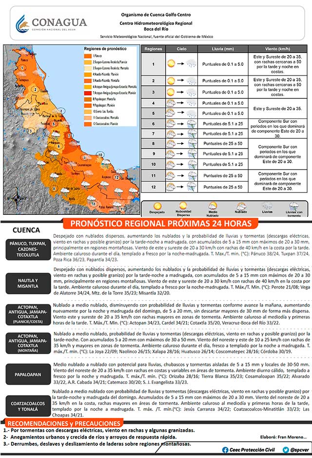 La onda tropical número 24 localizada sobre y al Sur del centro de Guerrero ha dejado una vaguada remanente en el Suroeste del Golfo de México; ésta se verá apoyada en la atmósfera superior con áreas de divergencia para mantener las condiciones de lluvia, chubascos y tormentas (actividad eléctrica, viento arrachado y caída de granizo) con los mayores acumulados sobre regiones montañosas de vespertinas a nocturnas, sin descartar algunas en horas de la madrugada del domingo. Viento en la costa del Noreste, Este y Sureste de 20 a 30 kilómetros por hora con rachas eventuales de 40 kilómetros por hora. El ambiente continuará caluroso y bochornoso durante el día, refrescando al momento de las lluvias y para la tarde-noche y madrugada.