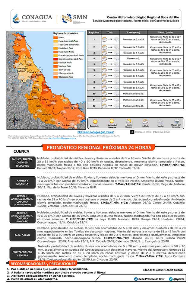 Persiste las condiciones para nieblas, neblinas, lluvias y tormentas aisladas con acumulados importantes en la zona de Los Tuxtlas y cuencas del sur. Continuará el viento del norte con rachas de 60 a 70 kilómetros por hora en la costa centro y sur con oleaje elevado, decreciendo. Ambiente templado a fresco.
