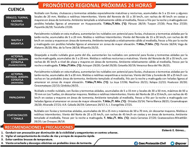 Se prevén pocos cambios en las condiciones del tiempo durante las próximas 24 a 48 horas en territorio veracruzano, por lo tanto, continuará dominando el temporal lluvioso como resultado de la persistencia de una vaguada en superficie con eje sobre el suroeste del Golfo de México y de su apoyo con la divergencia del viento en la atmósfera alta. Se esperan acumulados máximos de 50 a 70 mm en Los Tuxtlas y cuencas del Coatzacoalcos-Tonalá, de 20 a 50 mm en el Papaloapan y de 5 a 20 mm en el resto. El ambiente templado a relativamente cálido al mediodía, fresco a frío por las noches-madrugadas con probables heladas ligeras al amanecer en zonas de mayor elevación.