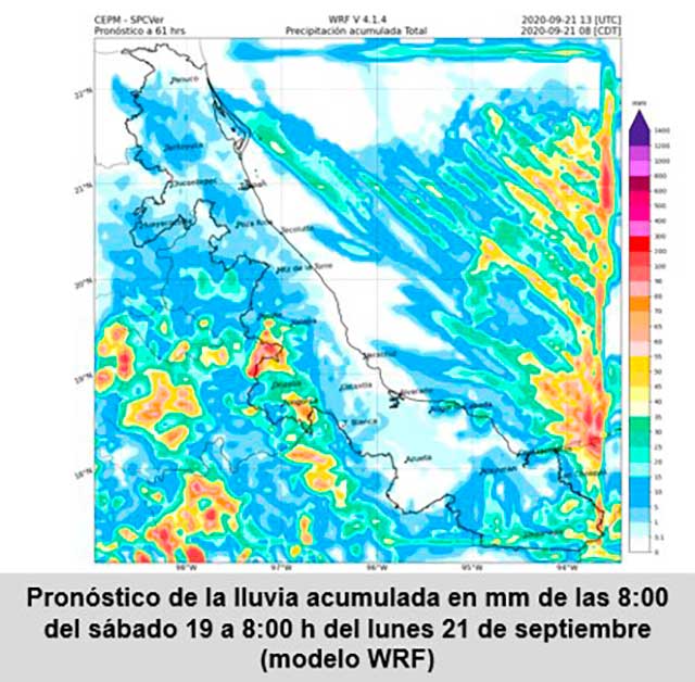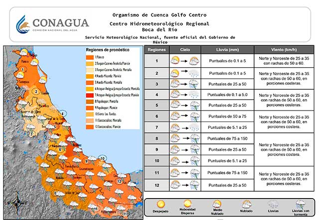 Mientras, en Veracruz se pronostica un sábado parcialmente nublado, probabilidad de lluvias o tormentas dispersas, acumulados de 5 a 15 milímetros y puntuales de 30 a 50 milímetros, matutinas en llanura-costas y por la tarde-noche en montañas. Probabilidad de anegamientos, crecida de ríos/arroyos y deslizamientos o derrumbes.