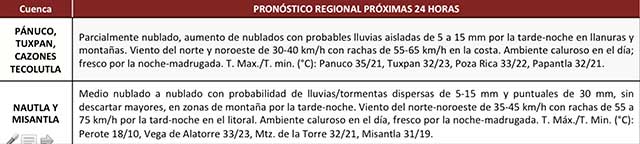 El viento dominará del norte-noroeste, desarrollaría rachas de 55 a 75 kilómetros por hora por la tarde noche en la costa central. Por su parte, las temperaturas diurnas serían elevadas y el ambiente relativamente cálido en montaña y caluroso-bochornoso en planicie y costas. Consulte el Aviso Especial.