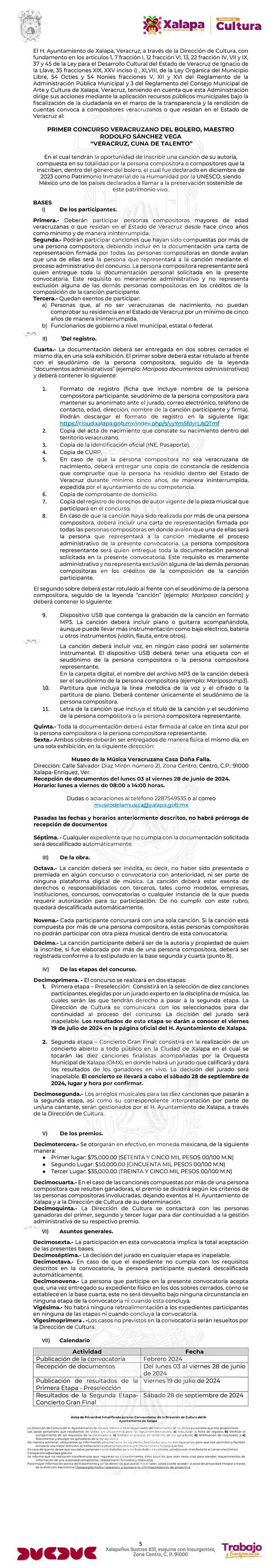 Se trata de una convocatoria emitida por el Ayuntamiento de Xalapa para que todos los amantes del género den rienda suelta a su creatividad. Así, 3 composiciones seleccionadas recibirán un estímulo de 75, 50 y 35 mil pesos. Los participantes deberán registrar una obra musical de su autoría en bolero, cuya creación sea inédita y contenga los elementos más representativos del género que fomenten la preservación de este patrimonio cultural humano.