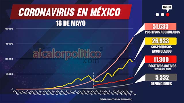 La Secretaría de Salud de la Federación registró 155 nuevas muertes por COVID-19, con lo que ya suman 5 mil 332. De esta manera, México acumula 51 mil 633 casos confirmados, 2 mil 414 más que ayer domingo.