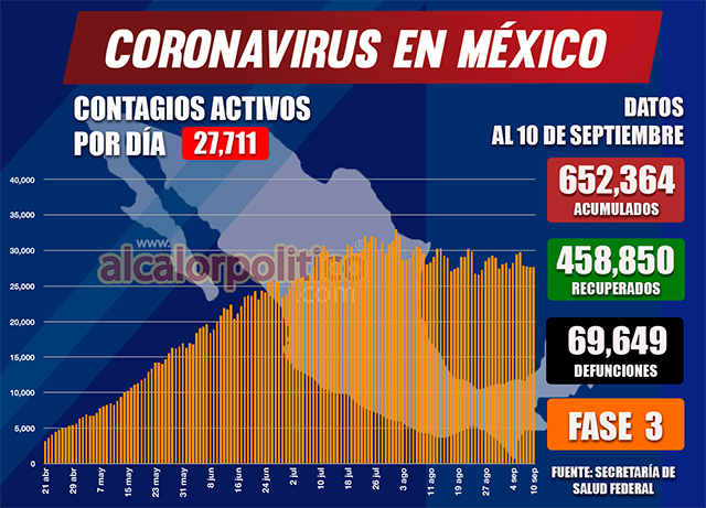 México sumó, al corte de este 10 de septiembre, 69 mil 649 muertes por Covid-19, con 652 mil 364 casos de contagios confirmados de coronavirus, según informaron autoridades de la Secretaría de Salud.